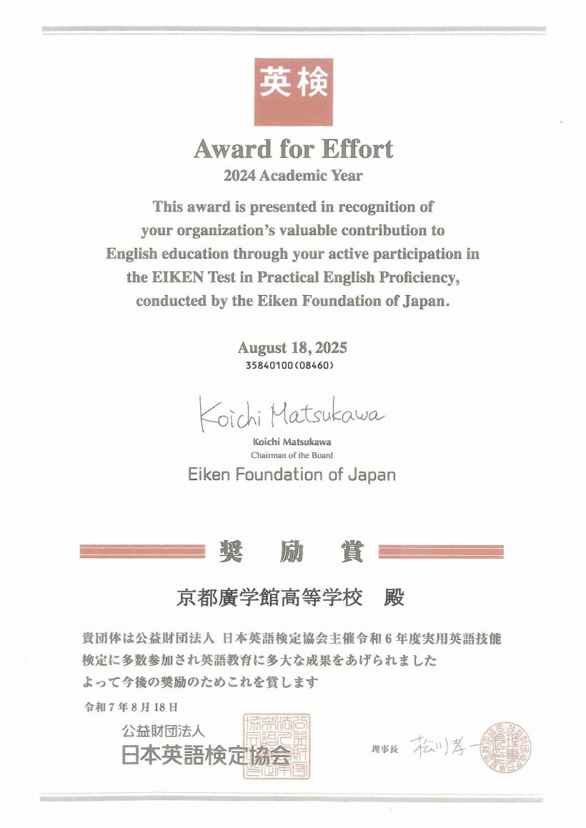 この度、本校は日本英語検定協会より、令和6年度の「英検奨励賞」をいただきました。