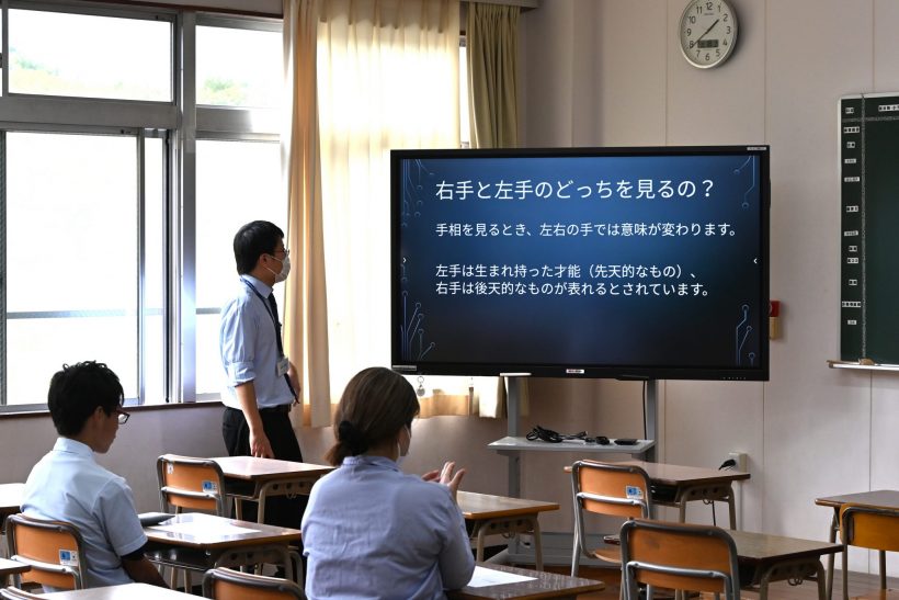 体験授業では、本校の授業の”探究ゼミ”で行っている「野外活動」と「手相の世界」、「コーチング」を体験していただきました。