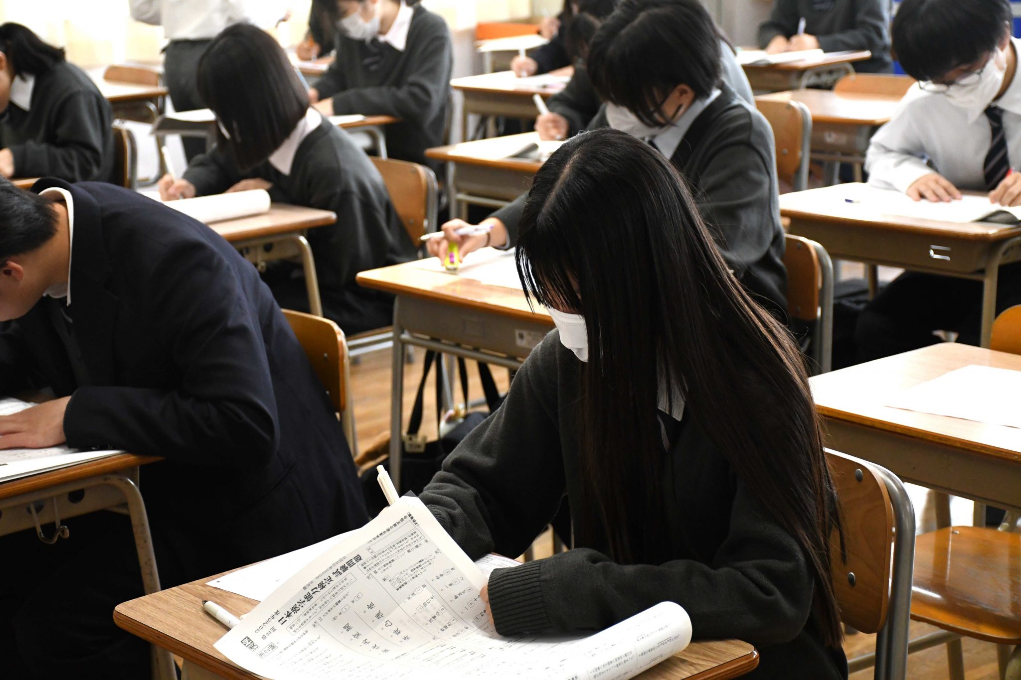 生徒たちはそれぞれの級に分かれて受験し、緊張しながらも真剣な表情で問題に取り組んでいました。
