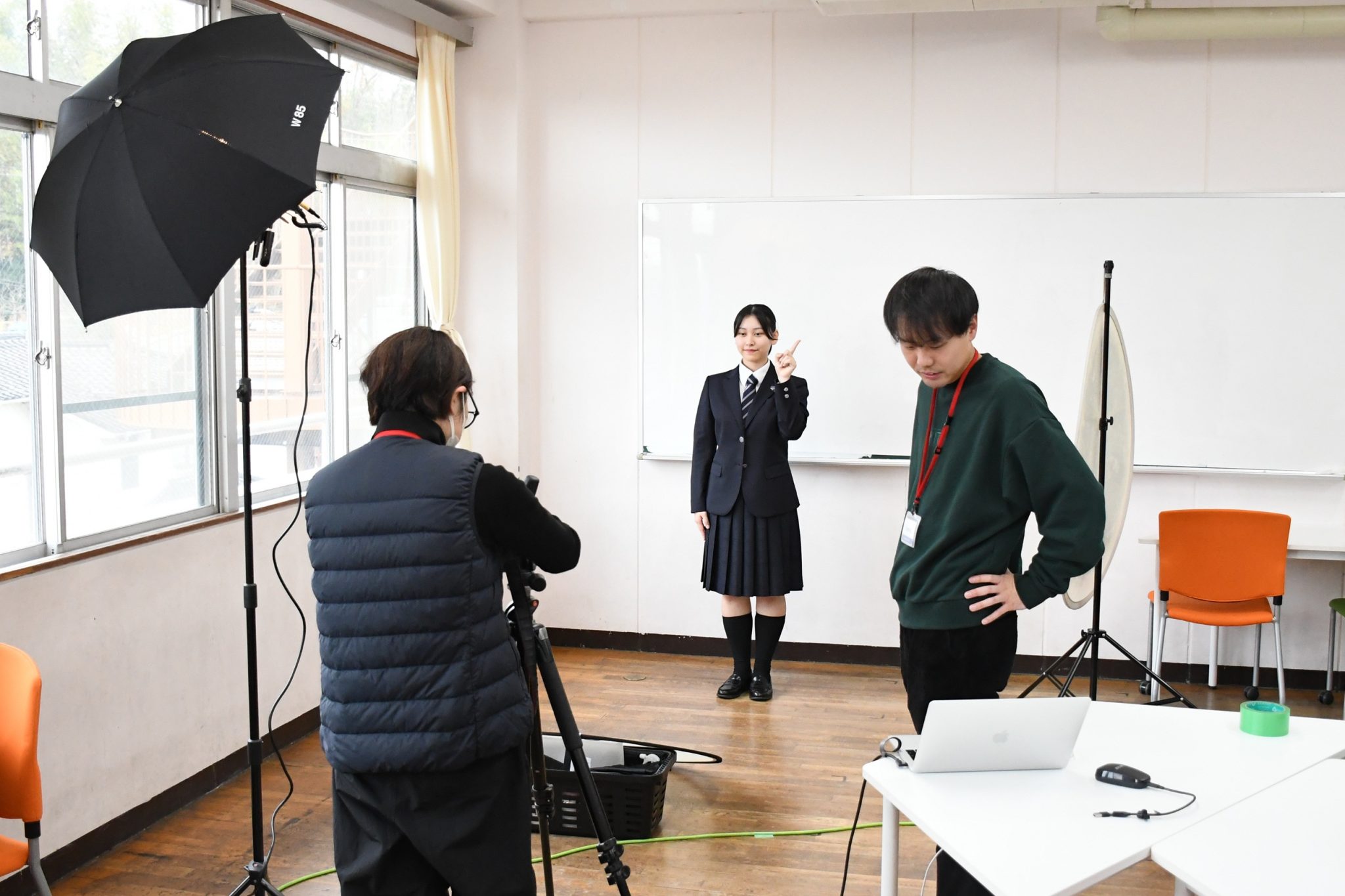 多くの生徒に協力してもらい、教室や体育館など、さまざまな場所で撮影を行っています。