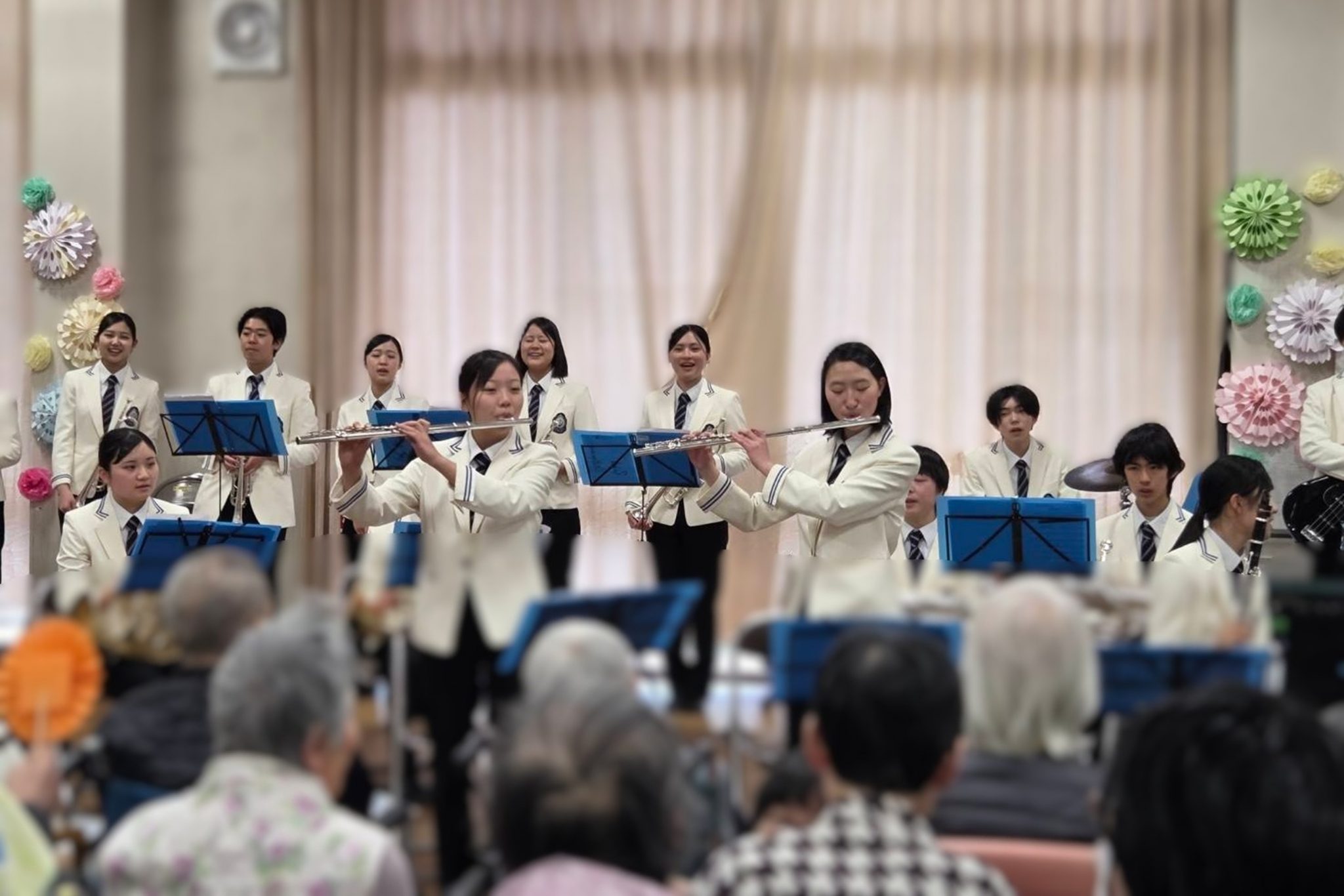 昨日、吹奏楽部Blue Lilies〈重点クラブ〉が特別養護老人ホーム「天ケ瀬苑」で開催された「地域交流会〜世代を越えて奏であう音楽会〜」に参加しました。