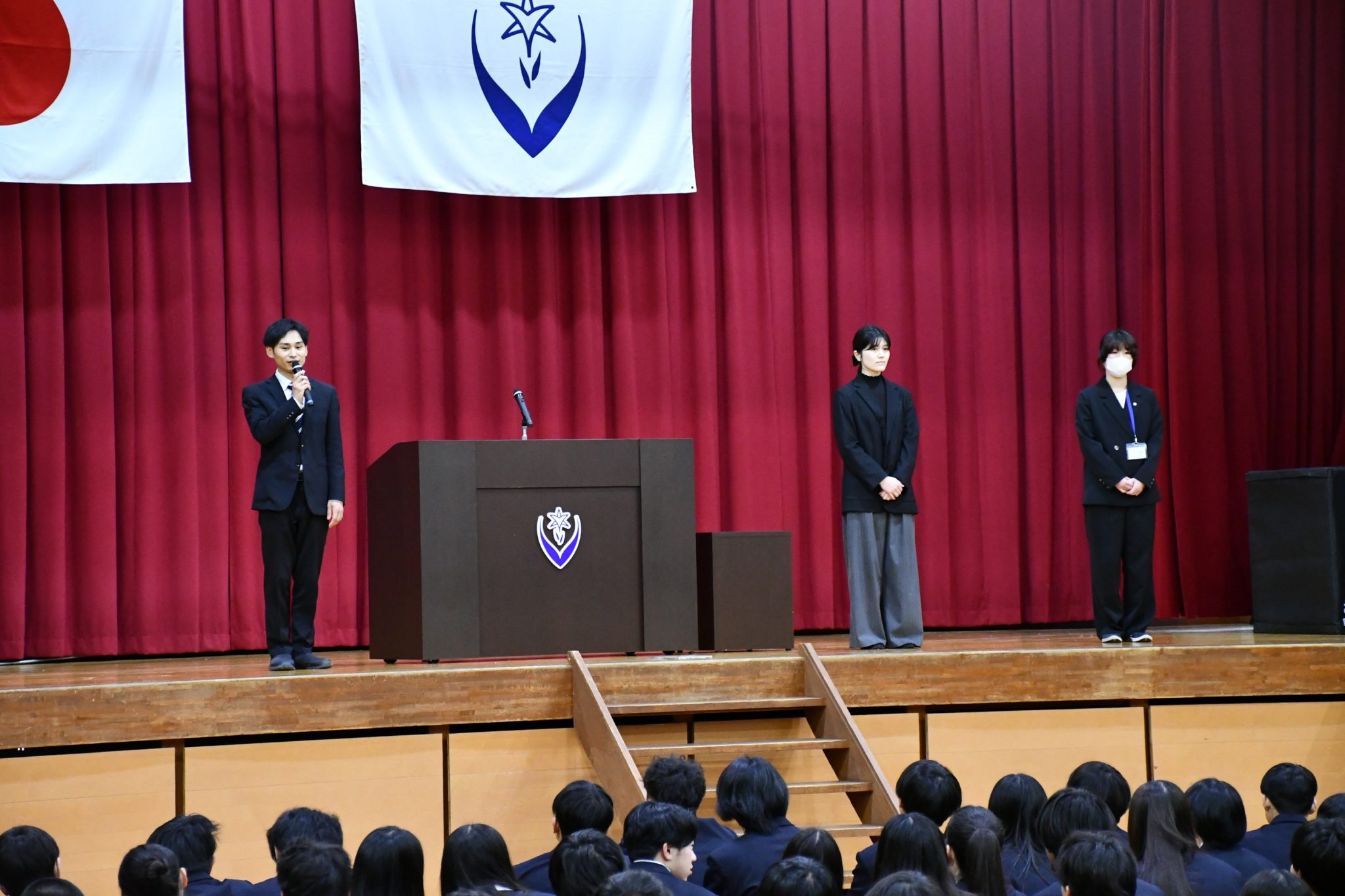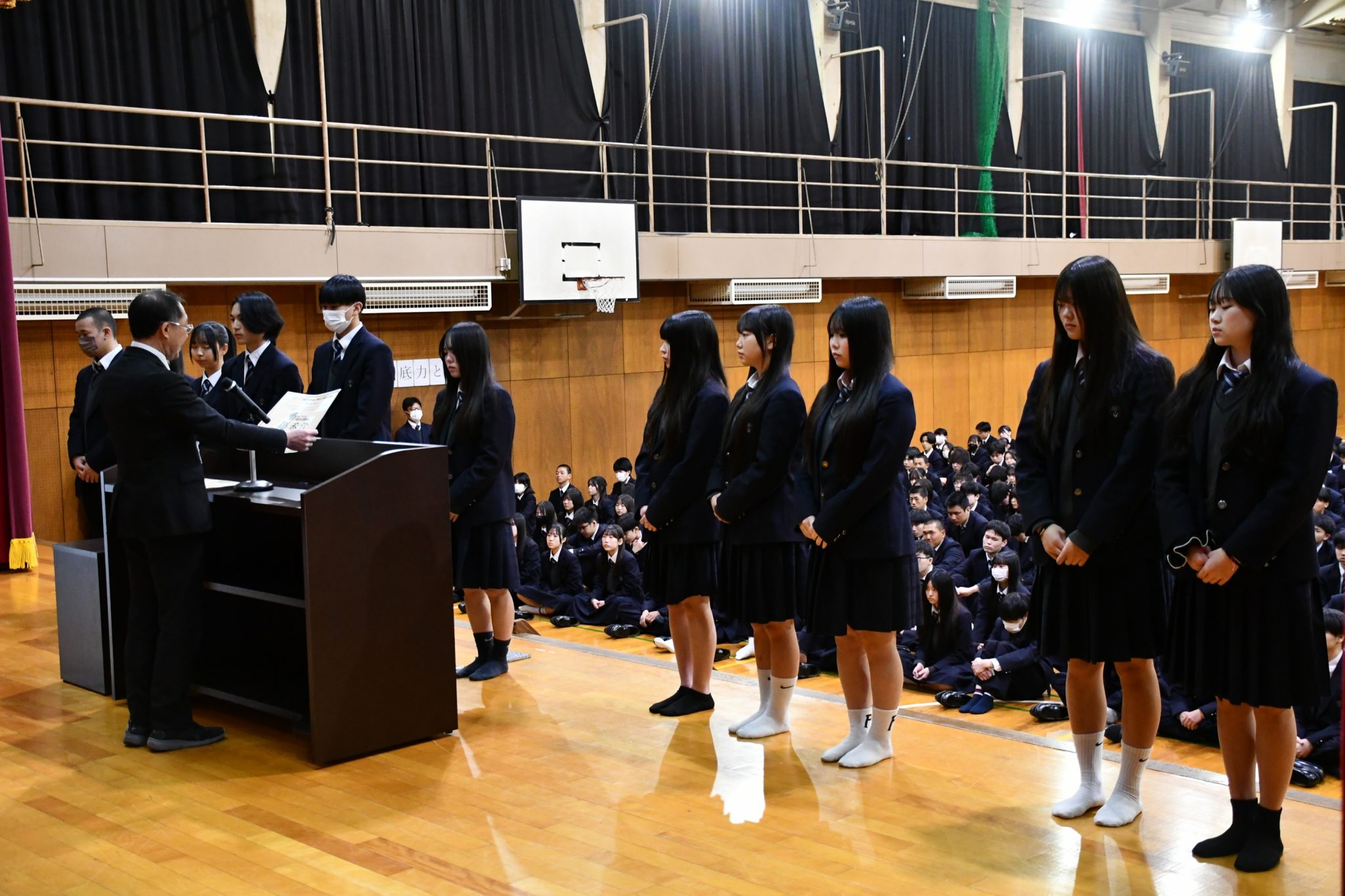 また、春休み中に京都府代表として大会に出場するラグビー部の生徒3名を紹介し、激励の言葉が送られました。