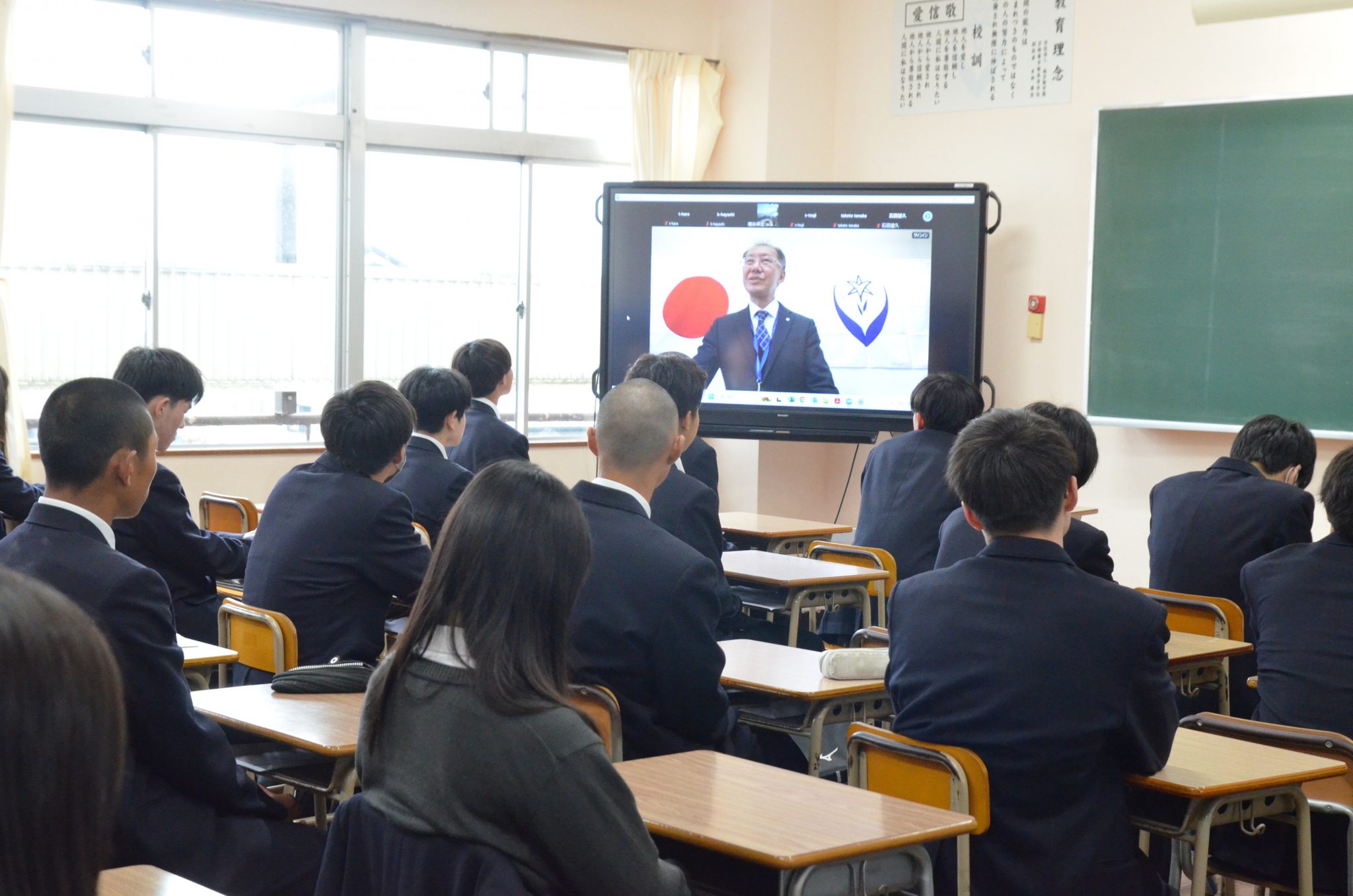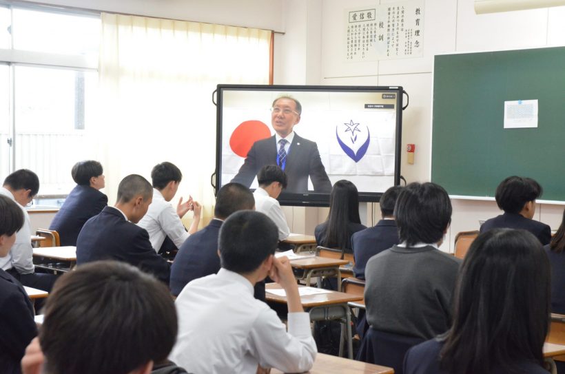 あいにくの空模様となったため、本日の始業式は体育館ではなく、各教室をZOOMで繋いで実施いたしました。
