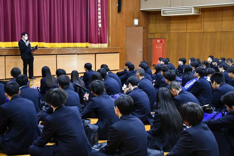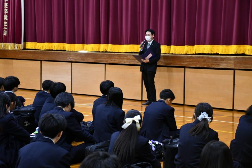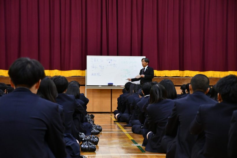 2年生の学年集会では、研修旅行についてや3年生と同じく進路決定に向けての話がありました。