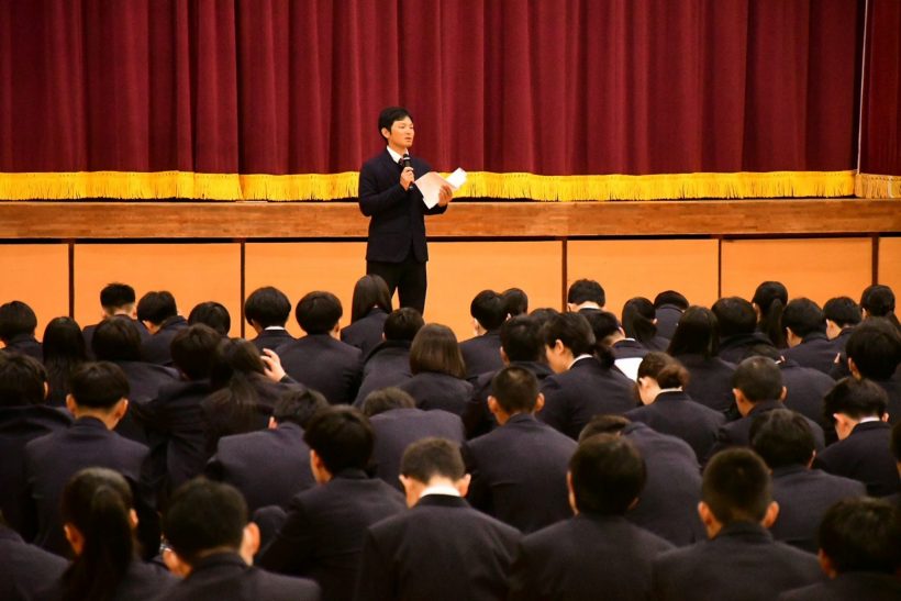改めて学年団の先生の紹介があったあと、校則等の高校生活を送るうえでの諸注意を学年部長、生徒部長の先生より行いました。