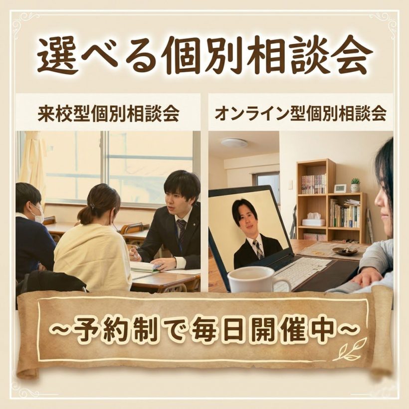 お知らせ 毎日開催!選べる個別相談会のご案内 進路選びで大切な情報を、気軽に相談できる個別相談会を毎日開催しています! 教育理念や方針・入試制度・コース内容や、話題の通信制「クエストコース」についても詳しくご案内します。 中学3年生や保護者の方など、どなたでも参加OK。「話を聞くだけ」でも大歓迎です! 相談方法は2つから選べます。 ・来校型(来校での対面) ・オンライン型(Zoom) 詳細・申込みは【コチラ】から。お気軽にご参加ください!