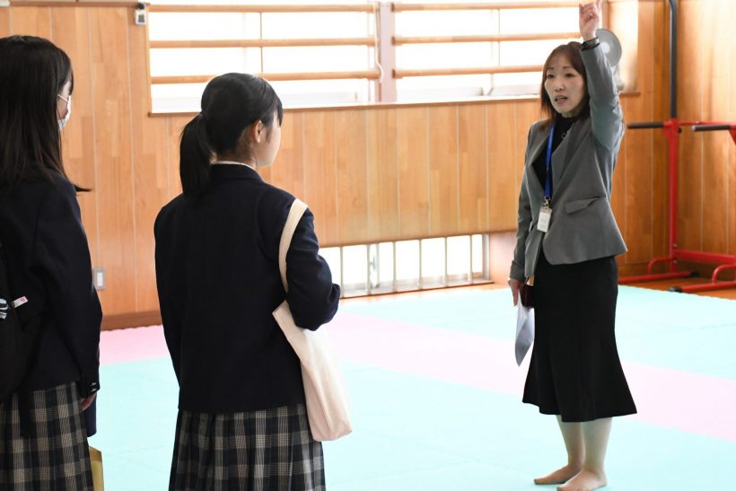初めに、瀧野校長から挨拶があり、その後、武道場やグラウンド等の施設見学をしていただきました。