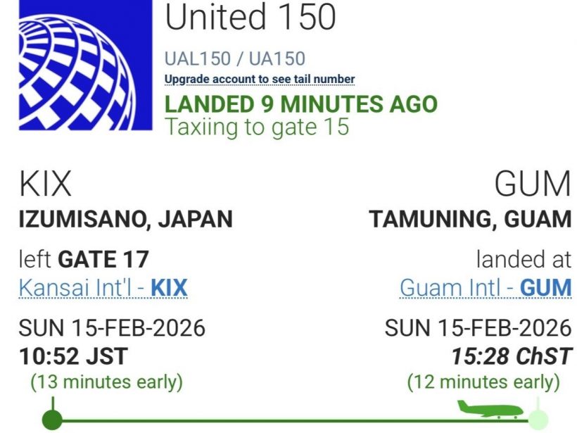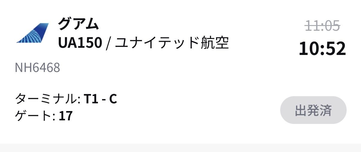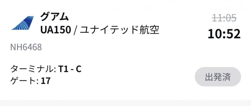 この後、出国手続きを行い、11:05 ユナイテッド航空150便にてグアムへ向かいます。予定到着時刻は15:40(現地時間)です。