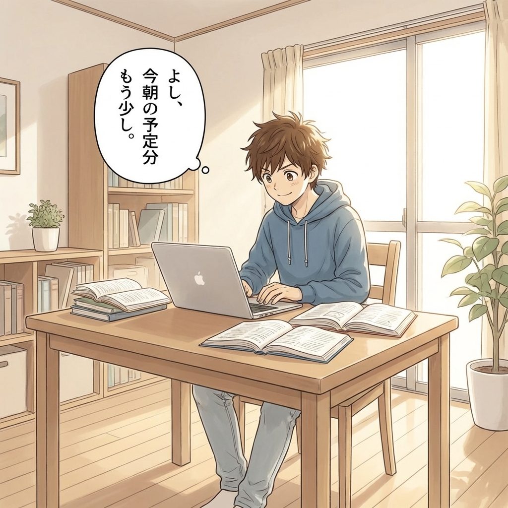 主人公は、クエストコースで学ぶ2年目の男の子。 かつては朝、学校へ行くことに強い不安を感じていた彼ですが、今の朝はとても穏やかです。「よし、今朝の予定分、もう少し」