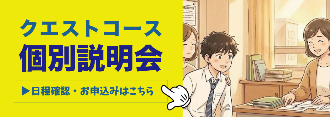 クエストコースの個別説明会では、「なぜ学校に行けなかったの?」と過去を掘り起こすような質問はしません 。私たちが提供できる安心の仕組みを一生懸命説明する「プレゼン」の時間ですので、どうぞ気楽にお越しくださいね 。