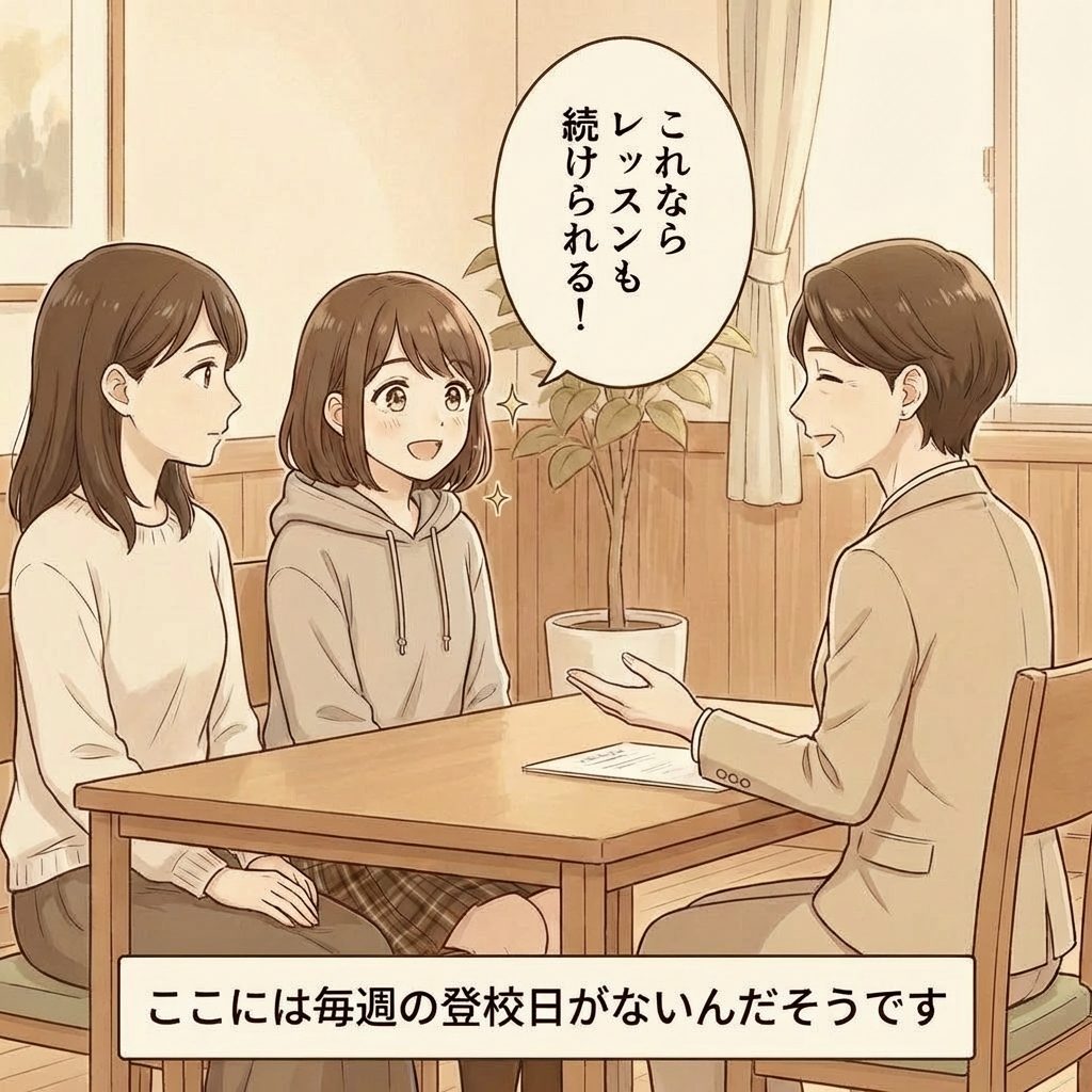 先生から「ここでは『しなくて良いこと』を大切にしているんだよ」という話を聞き、主人公は確信します。「ここなら、レッスンを続けられる!」 。
