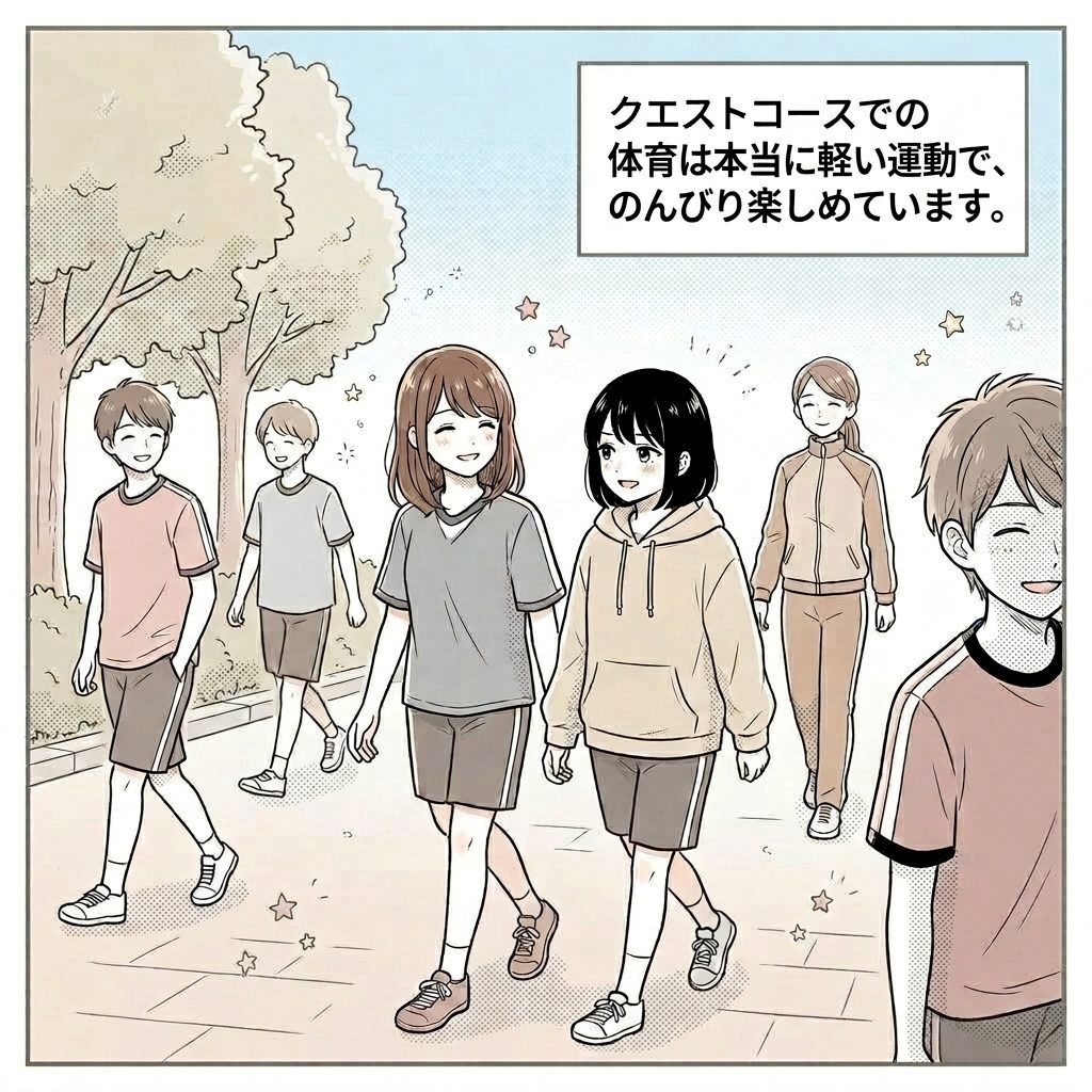 クエストコースでは、体育を、自宅学習で固まった体をほぐす「リカバリー」の時間と捉えています 。外の空気を吸い、自分のリズムで歩く。そんな穏やかな時間が、失いかけていた自信を少しずつ取り戻させてくれます。