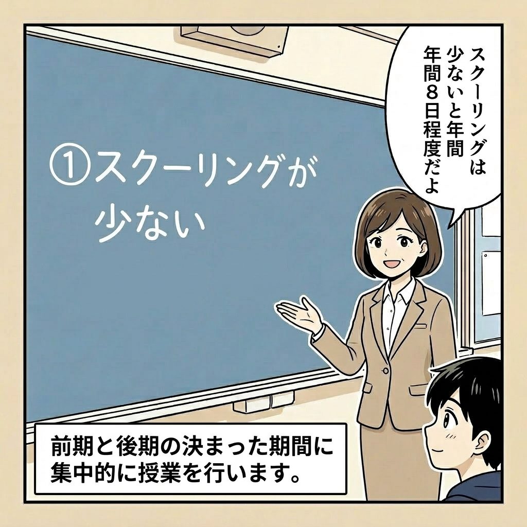 ⏱️「もっと日数が少ない学校もあるよね?」と思うかもしれませんが、日数を極端に減らすと、朝から夕方まで1日中ぶっ通しで授業を受けなければなりません。