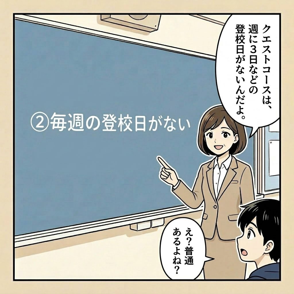📖高校を卒業するためには、対面で授業を受ける「スクーリング」が必要です。📅クエストコースでは、このスクーリングが特定の期間に集中していて、日数がとても少ないのが特徴です。