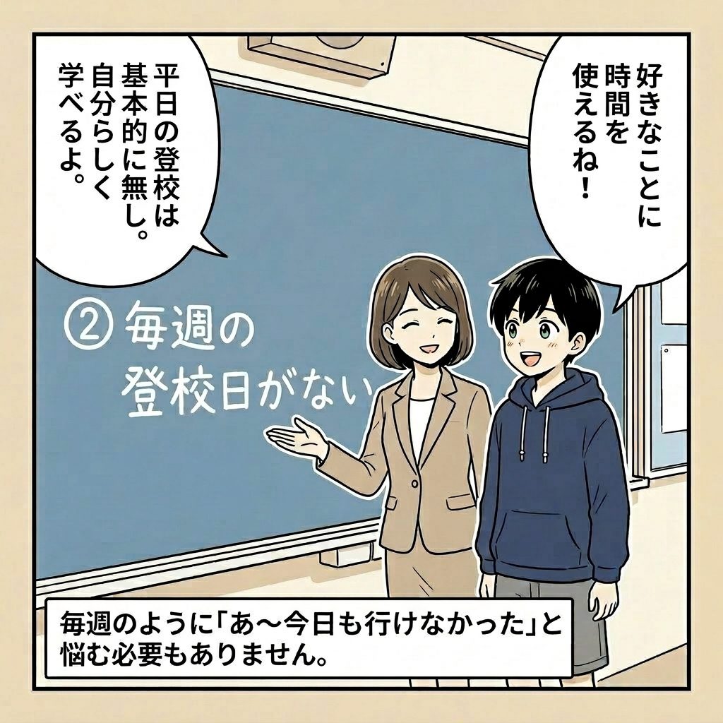 ☀️クエストコースでは、1日の負担を軽くするために、登校日をすべて「午後から」にしています。朝起きるのがつらい人でも、無理なくゆったり通えるように工夫されています。