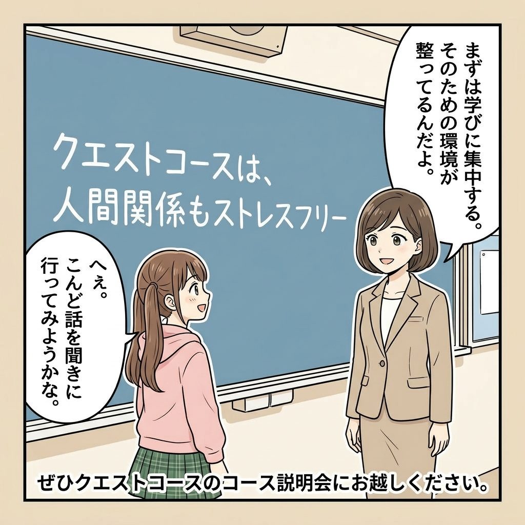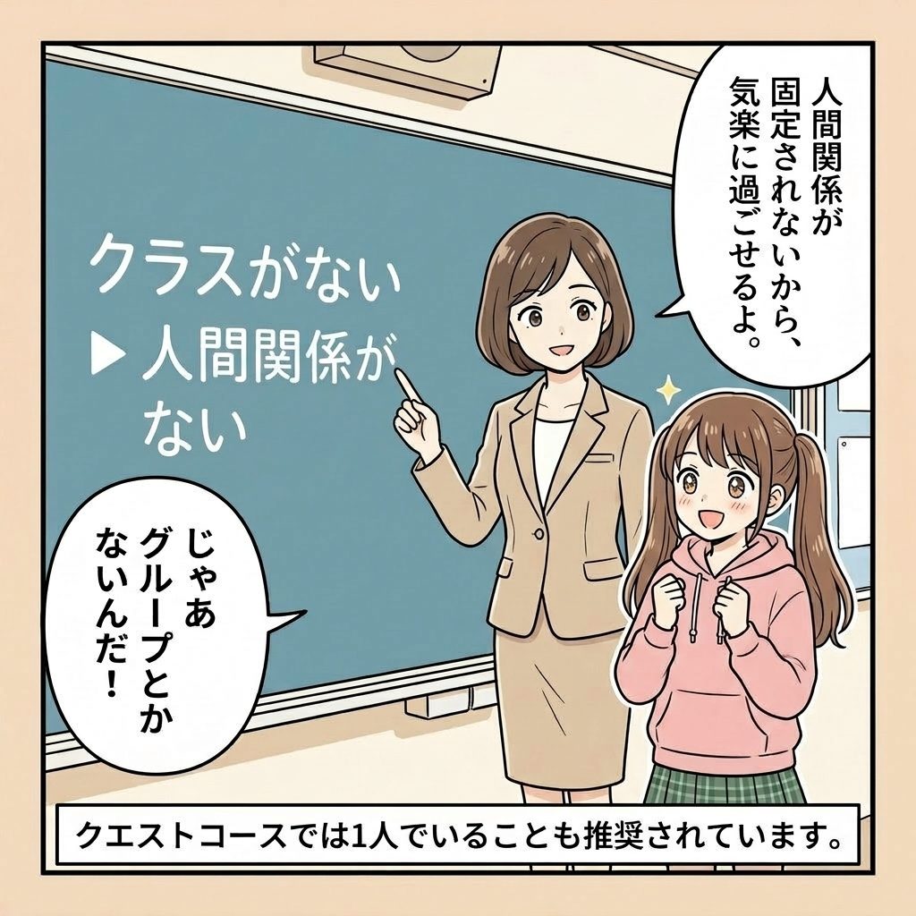 学校での生活の中で、「クラスの雰囲気になじめない」「集団の中にいるだけで疲れてしまう」と感じたことはありませんか? 実は、そんな悩みを持つ中学生や高校生の皆さんと保護者様にとって、クエストコースが大切にしている「ある仕組み」が大きな安心材料になるかもしれません。